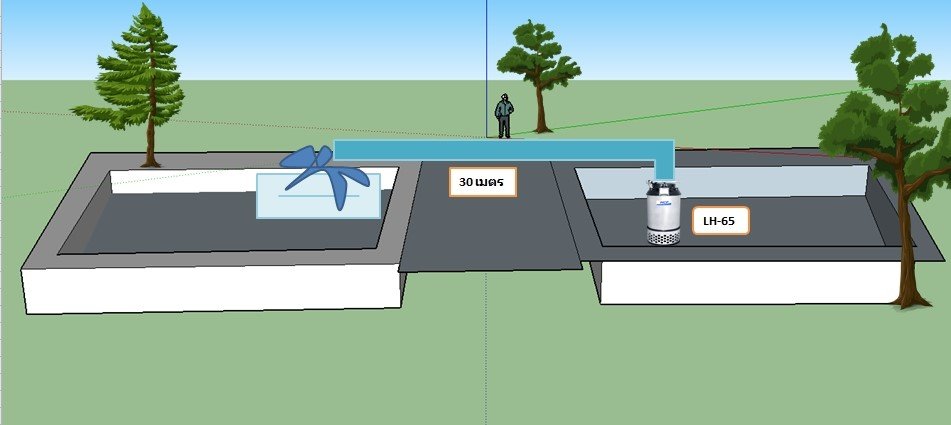 เนื่องจากทางฟาร์มมีการใช้ปั้มน้ำขนาดต่างๆเพื่ออำนวยความสะดวกภายในฟาร์ม และได้เลือกใช้ปั้มน้ำที่มีขนาดท่อส่ง 6 นิ้ว เพื่อต้องการสูบน้ำจากบ่อพักน้ำเข้าบ่อเลี้ยงกุ้ง ด้วยระยะส่ง 30 เมตร โดยปั้มรุ่น LH-65 ซึ่งมีขนาด 6 นิ้ว 5 แรง และได้ปริมาณน้ำ 120 คิวต่อ ชั่วโมง ซึ่งปริมาณการกินกระแสไฟ ประมาน 7.2 แอมแปร์(A) และ ตอบโจทย์ความต้องการของลูกค้าได้เป็นอย่างดี