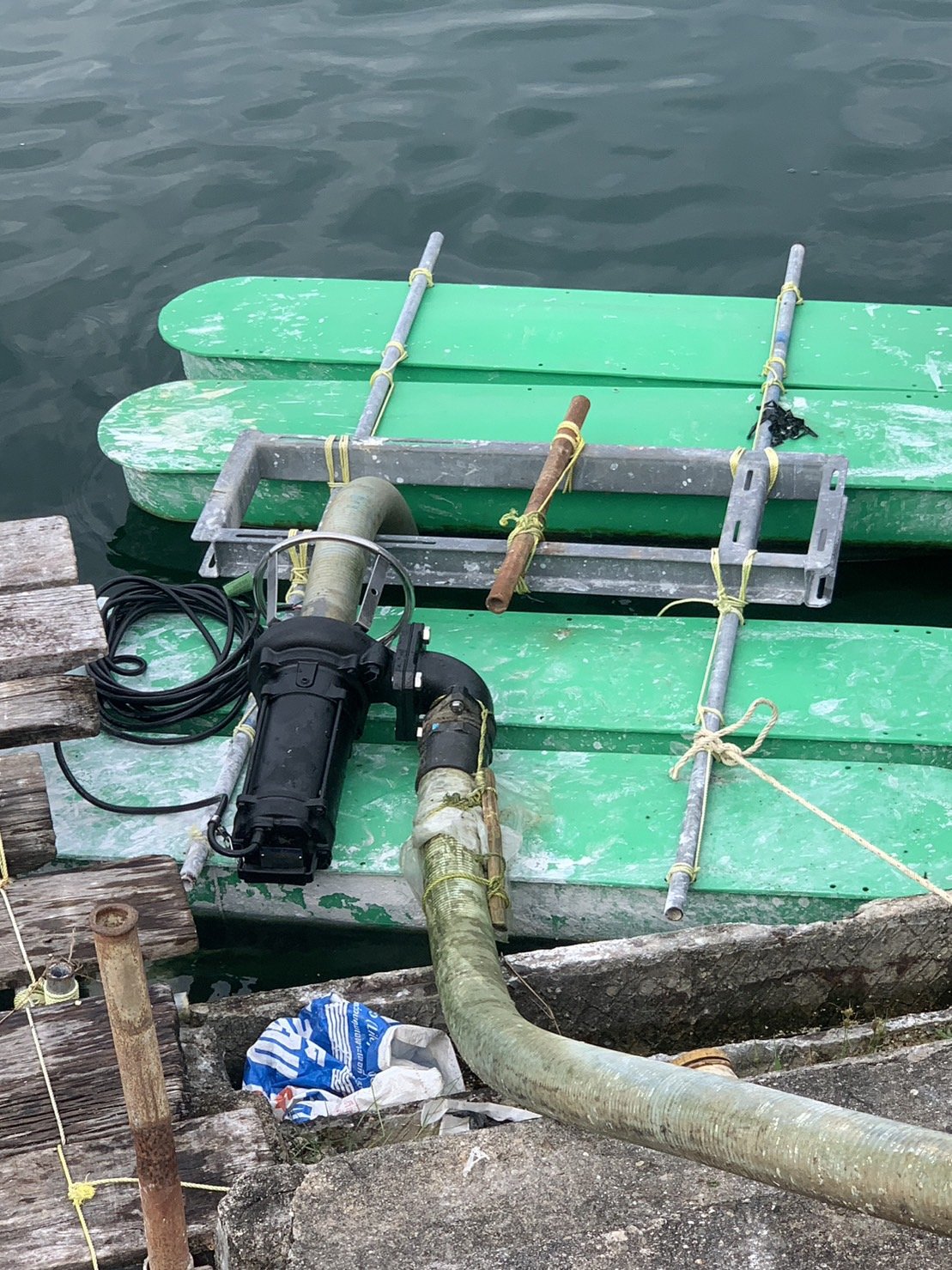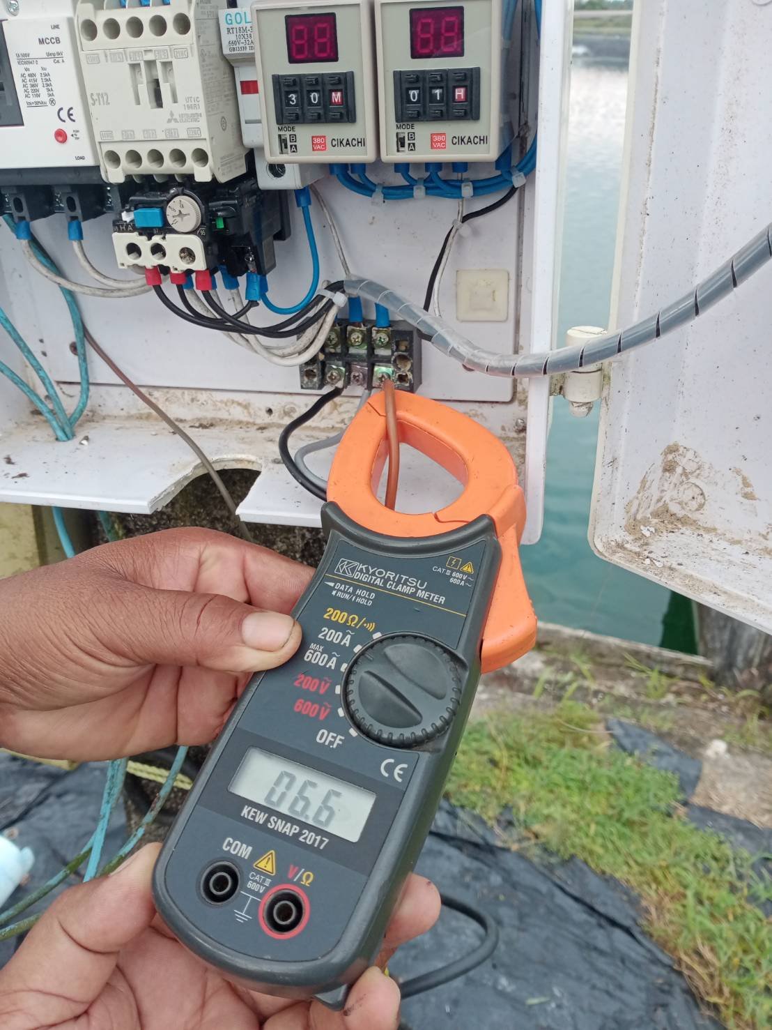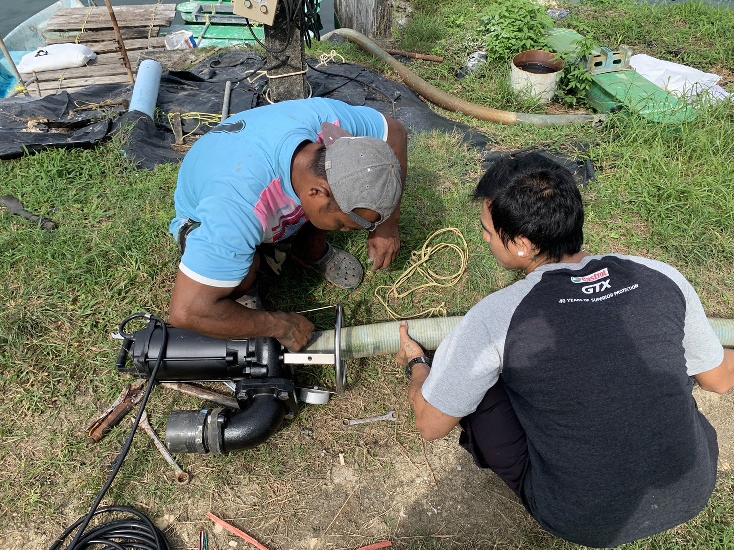 เนื่องจากเดิมลูกค้าใช้ปั๊มหางในการดูดเลนจากหลุมกลางบ่อเลียงไปทิ้งเลนระยะ 180 เมตร ทำให้เกิดความยุ่งยากในการติดตั้งและดูแลซ่อมบำรุง และมีข้อจำกัดในการใช้จำนวนแอมแปร์ (A)ของไฟฟ้า จึงแนะนำปั๊มจุ่มรุ่น FN-35P-A1 (380V) ซึ่งมีขนาด 3 นิ้ว 5 แรง ในการดูดเลนหลุมกลางบ่อเลี้ยงที่ความสูงเพียง 2 เมตร และระยะส่งไปบ่อทิ้ง 180 เมตร กระแสไฟฟ้าวัดได้ ประมาณ 8-10 แอมแปร์ (A) ซึ่งเป็นไปตามความต้องการของลูกค้า
