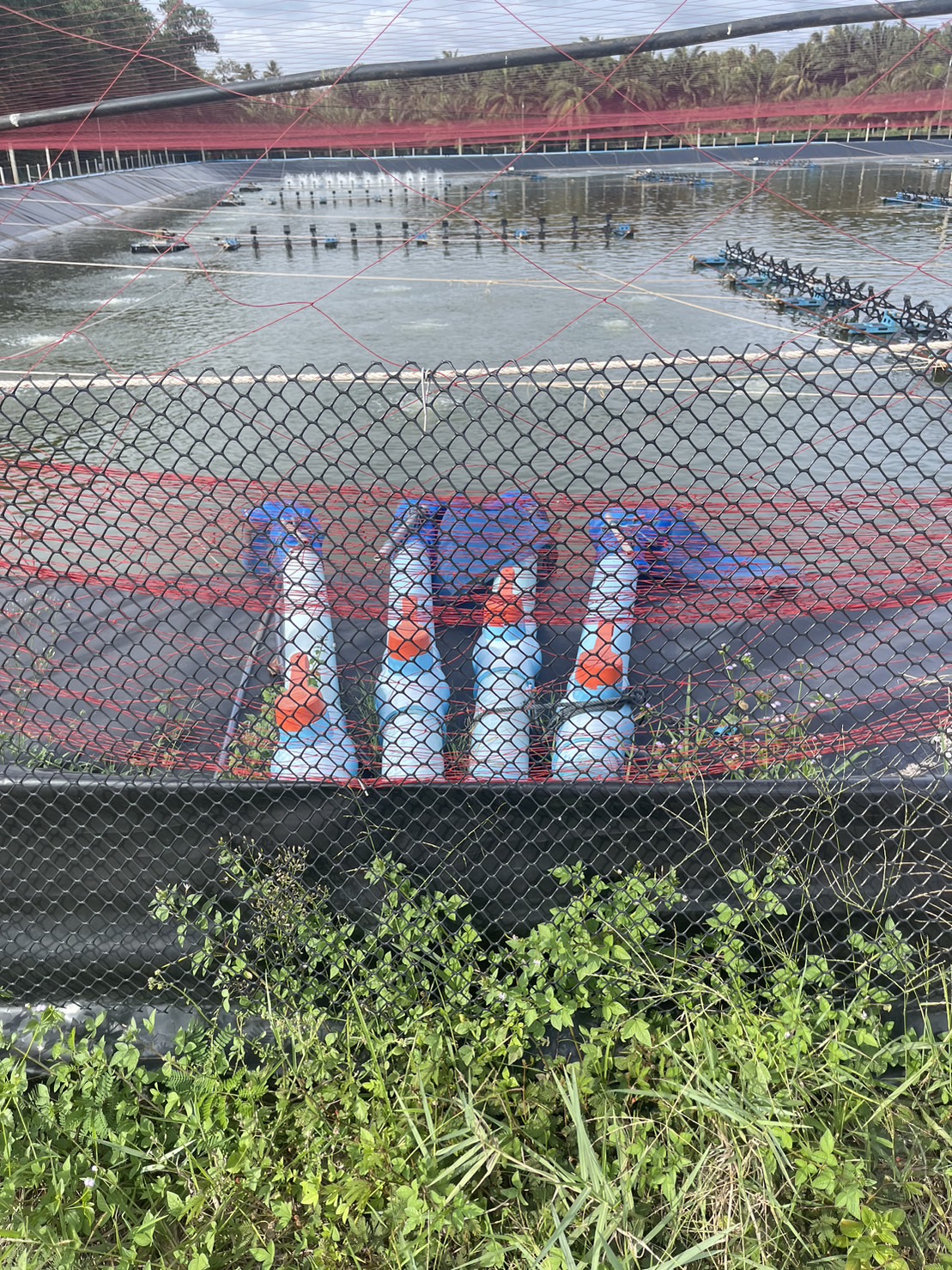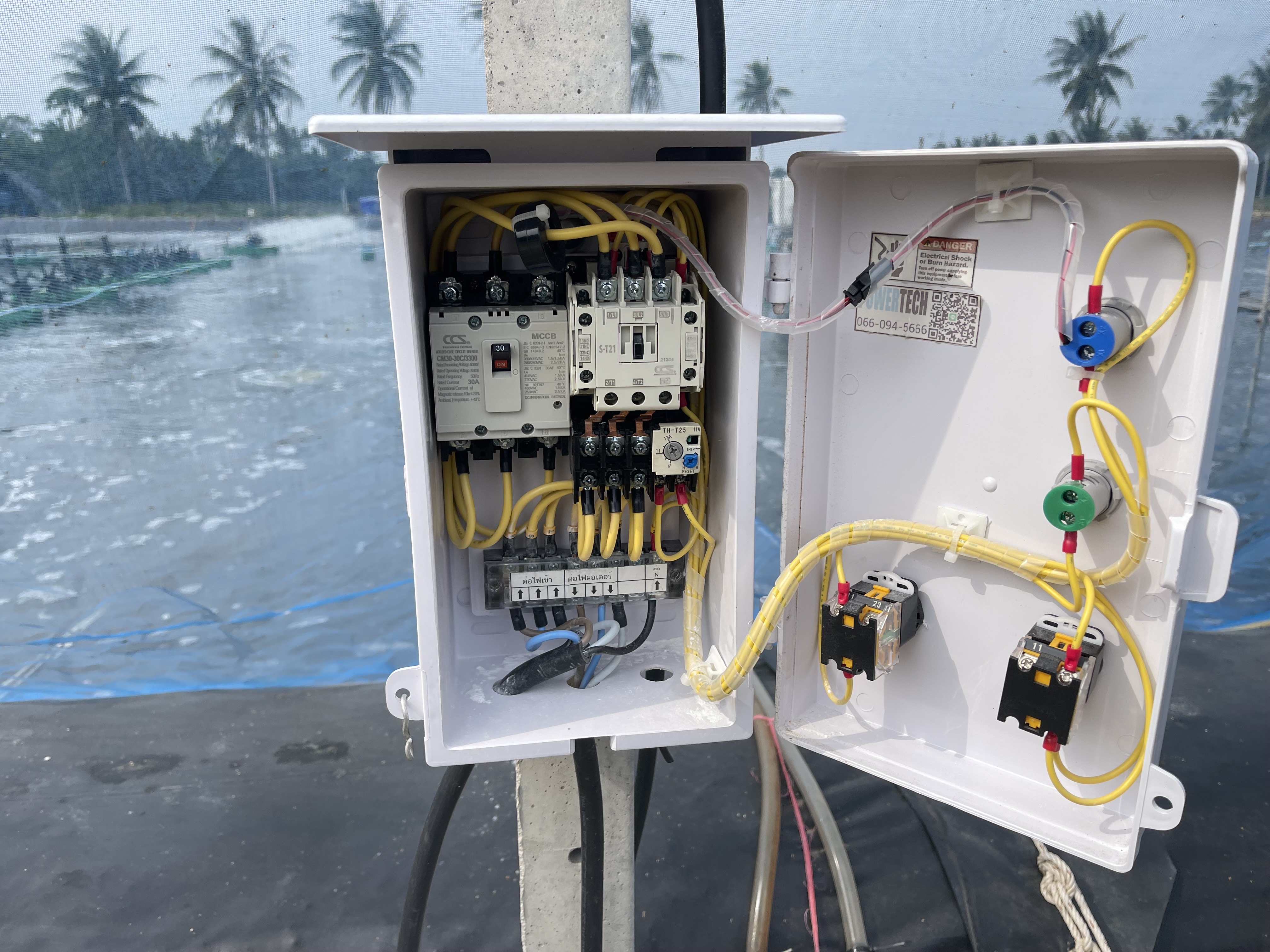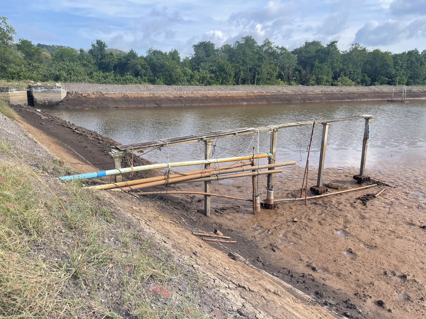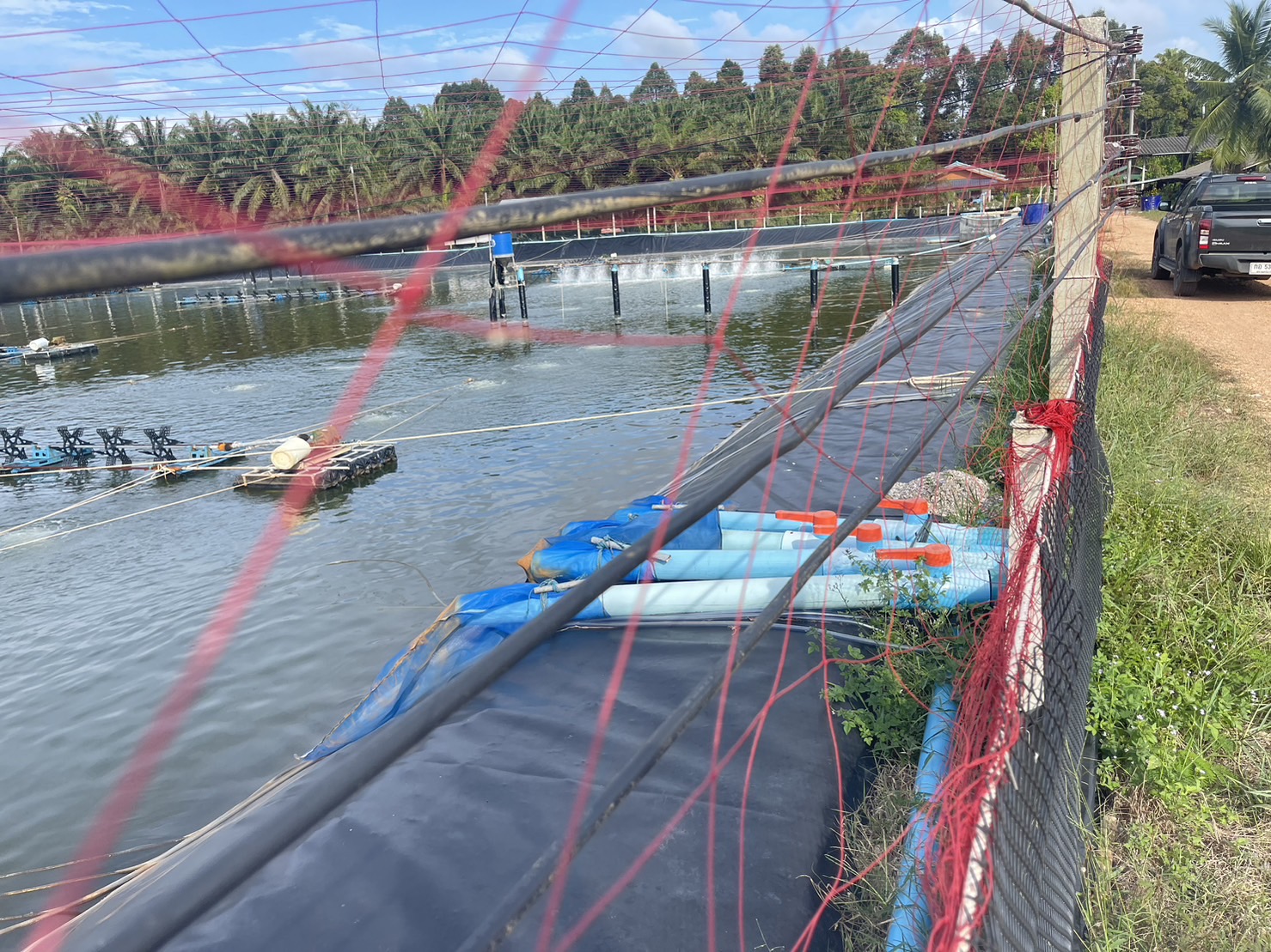 ฟาร์มกุ้ง บ่อเลี้ยงปรับปรุงระบบเติมน้ำ จังหวัดชุมพร ระบบดูดจากบ่อพักน้ำเข้าบ่อเลี้ยง เฮดขอบบ่อ 2 เมตร 4 ตัว ระยะส่ง 30 เมตร ใช้รุ่น IC-45B ระบบไฟ 380 โวลต์