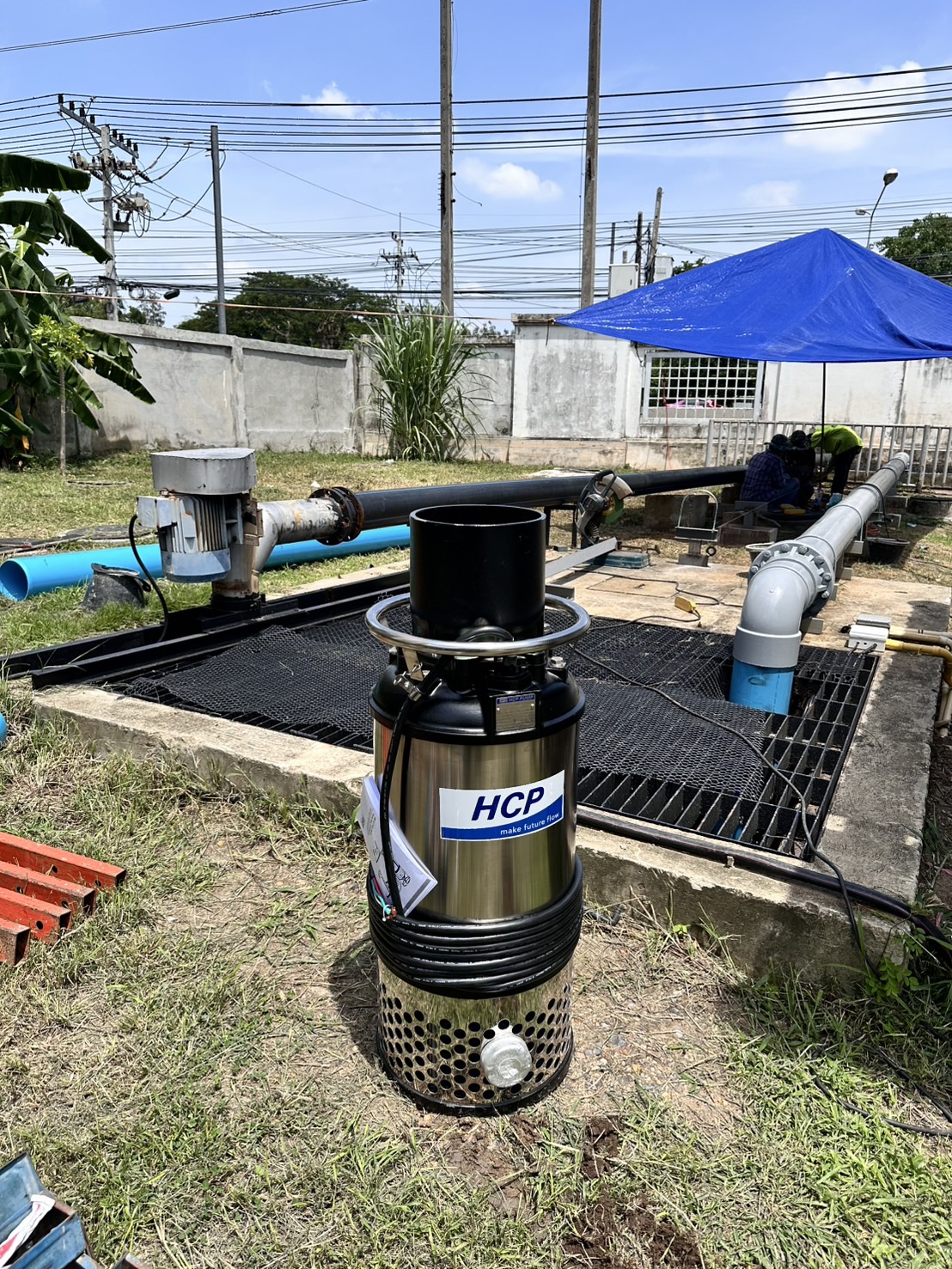 3. แนวทางการแก้ไขและรายละเอียดการติดตั้ง: ทีมงานได้เสนอให้เปลี่ยนมาใช้ ปั๊มจุ่ม (Submersible Pump) ยี่ห้อ HCP PUMP รุ่น LH-88 ขนาด 8”กำลัง 8 แรงม้า ซึ่งเป็นปั๊มน้ำเสีย (Sewage Pump) ประสิทธิภาพสูง